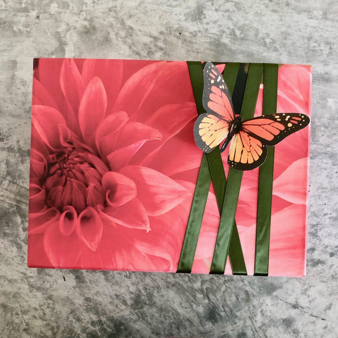 30代前半の妹さんへのお誕生日プレゼントに、華やかなイメージで貼り箱をお作りしました。