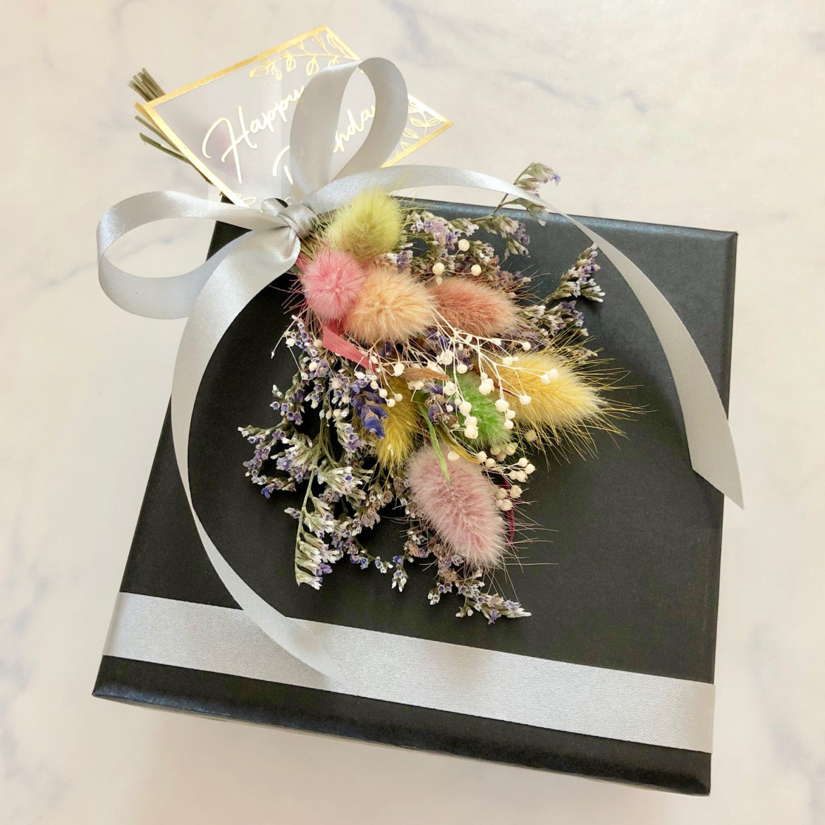 カラフルなドライフラワーのミニブーケをお付けした華やかな貼り箱をお作りしました。