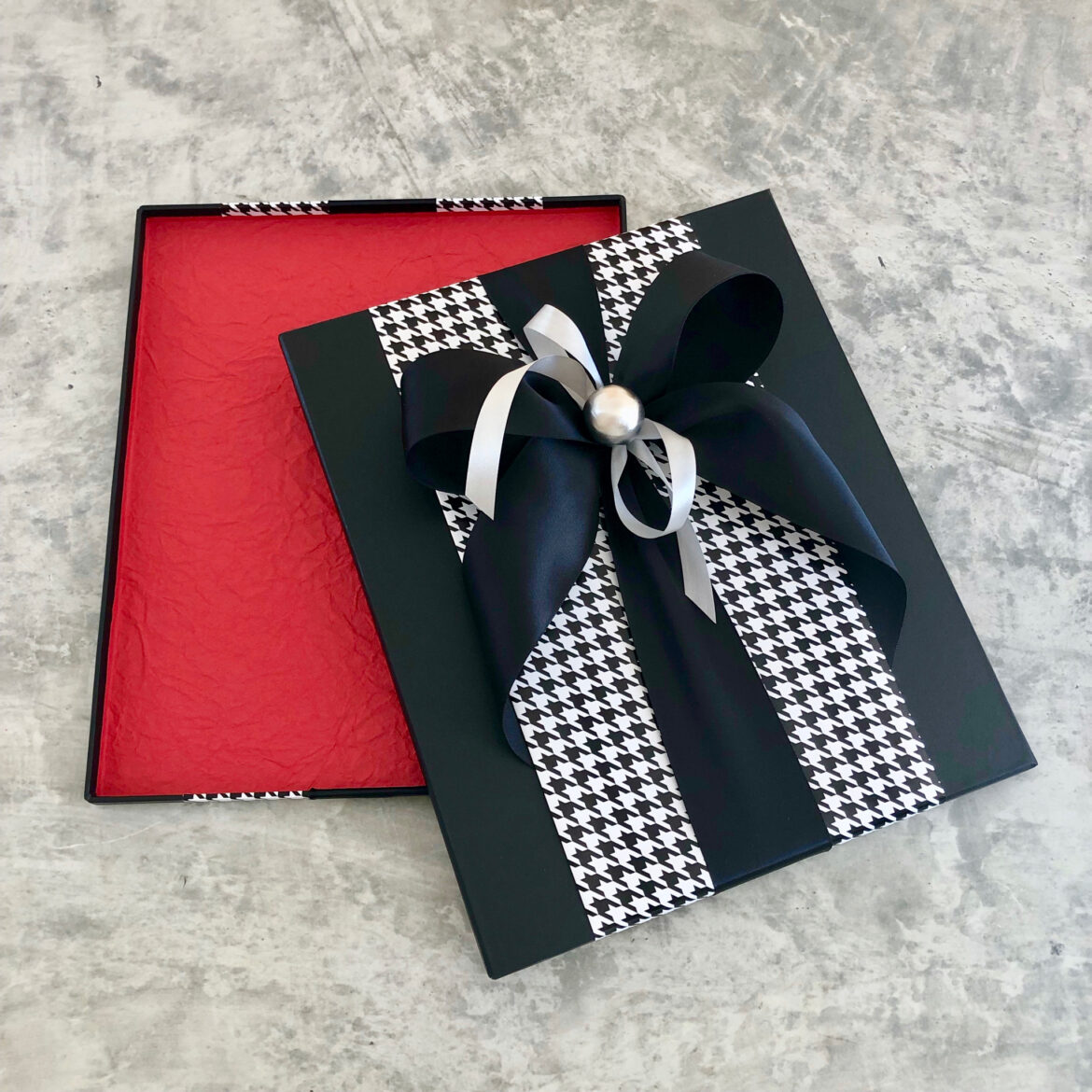 ご希望の雰囲気やお色を念頭に置き、男性に好まれそうなモノトーンをメインに華やかさも足した貼り箱です。
