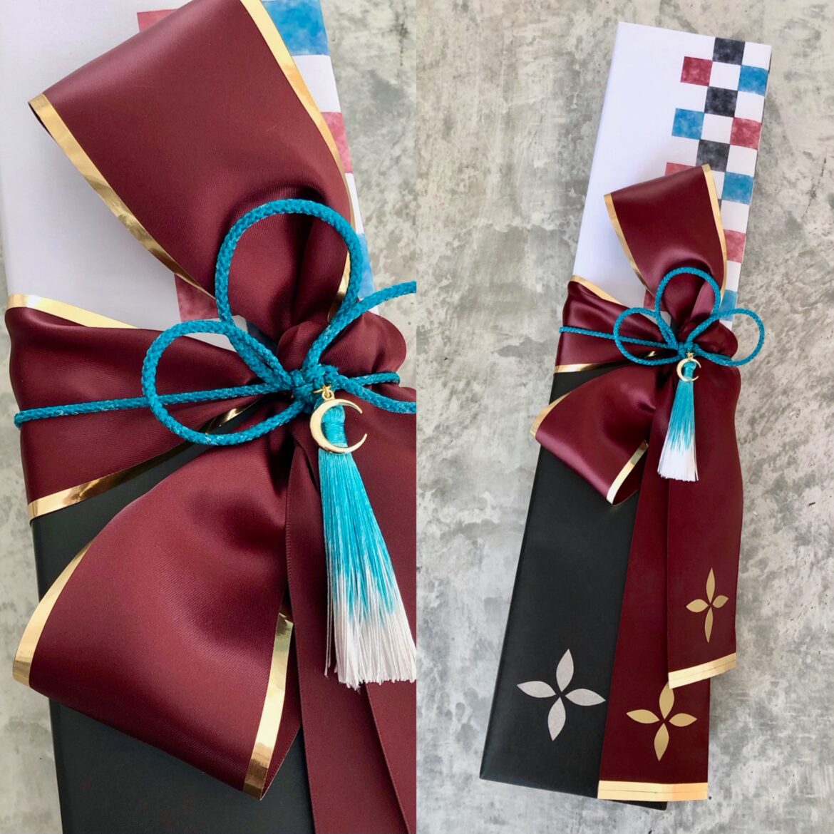包みにはエンジ色のリボンを縦結びにして、上からブルーの江戸打ち紐を結んでいます。