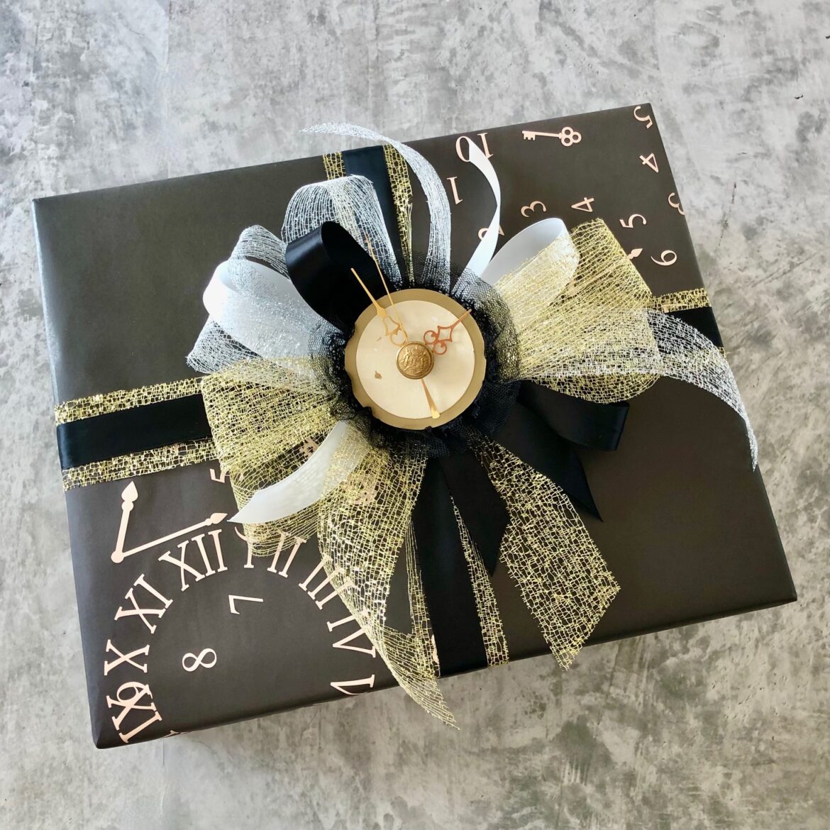 長きにわたりお勤めされたことを考え、「時を刻む」イメージで時計をモチーフにしたラッピングにしてみました。